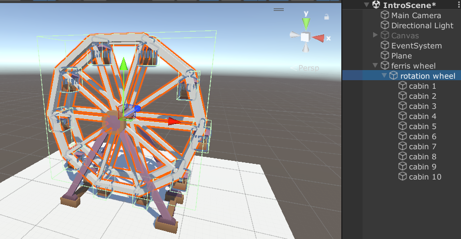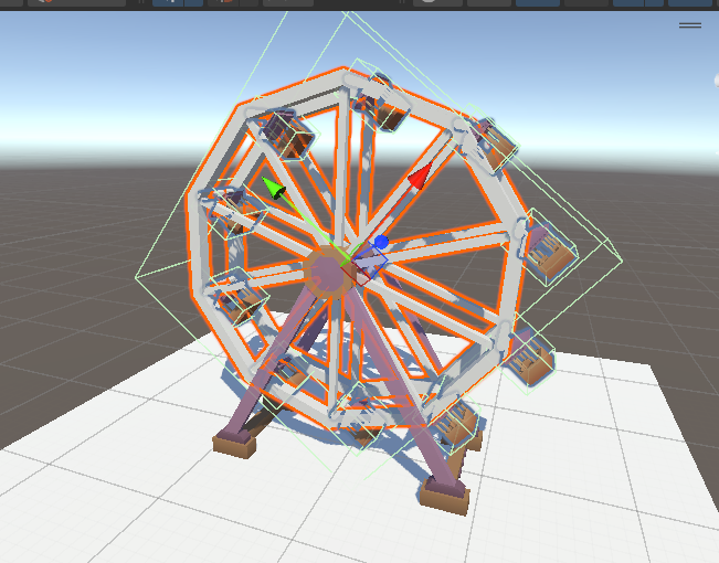 대관람차 전체가 돌아가는 동시에, 안의 자식 개체들도 z방향으로 같은 속도로 반대로 돌아 외부에서 확인하면 제 각도를 유지하는 모습처럼 보입니다.