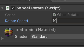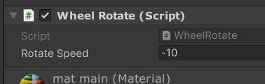 WheelRotate 스크립트를 만들어 위의 내용을 넣고, rotation wheel에 스크립트를 넣어줍니다.