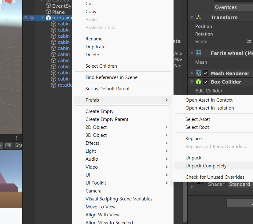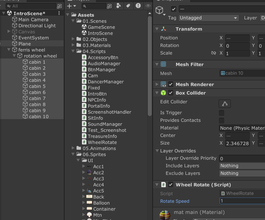 저는 대관람차 탑승하는 부분을 다른 애셋에서 추가해 넣어주었고, cabin별로 콜라이더도 잡아주었으며