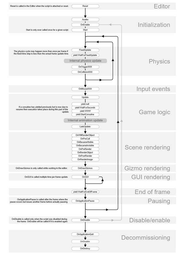 FixedUpdate: 프레임과 상관없이 절대적인 시간 기준으로 호출되는 Update문(기본 0.02초). 한 프레임에 여러번 호출 될 수 있음. 물리적으로 동일한 처리를 하기 위할때 주로 이용.
