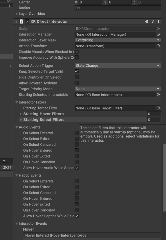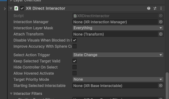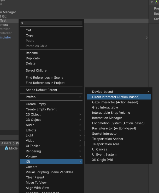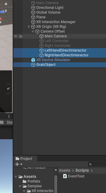 camera offset의 자식으로 XR > Direct Interactor 두개 생성해서 이름 정해주기