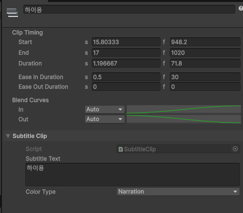 | SubtitleBehaviour.cs | 실행 로직 (Behaviour) | 타임라인 재생 중 매 프레임 실행. 전달받은 텍스트를 UI에 뿌려주고, info.weight를 사용해 클립간의 fade in / out 효과를 text 컬러에 반영. |