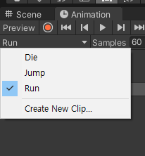 Player를 누른 상태로 Animation Window를 켜서 Create하며 Run.anim을 만들어주자.