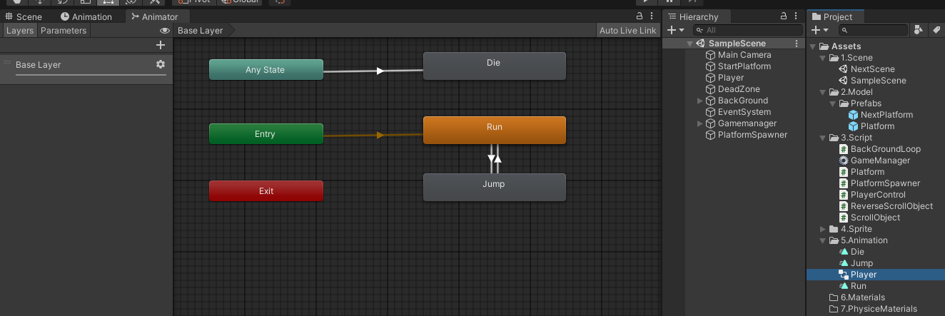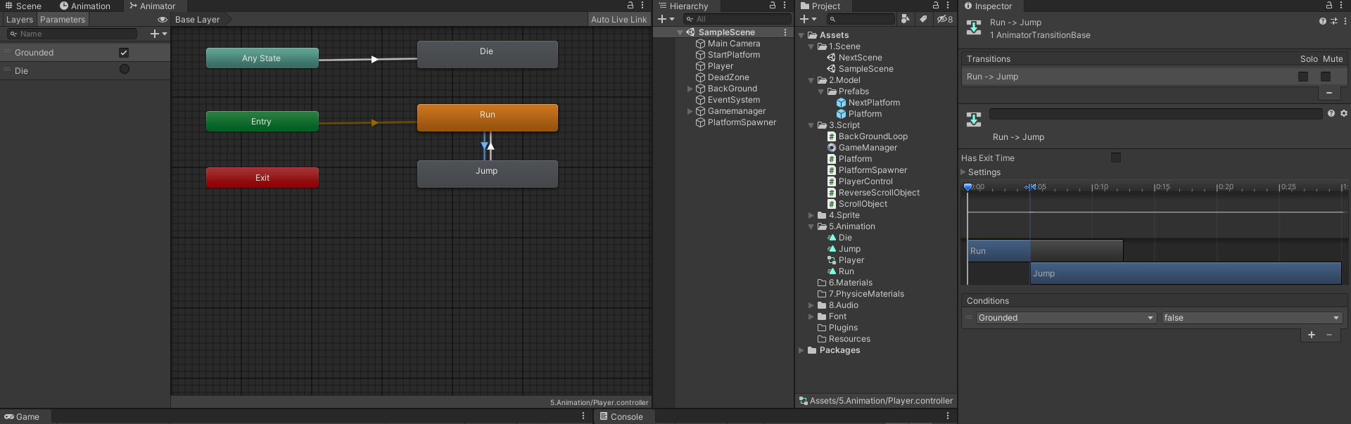 Bool로 Grounded를, Trigger로 Die를 추가한다. (발판에 닿았는지 확인, 트리거는 특정 값 할당이 불가, set하면true, 그 후 바로 false, 어떤 사건이 발생했을 때 전이가 일어나게 하는 조건에 많이 사용)