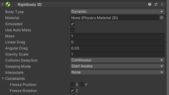또한 Constraints에서 혹시 모를 Z축으로의 회전을 방지하기 위해 Freeze Rotation을 걸어준다.