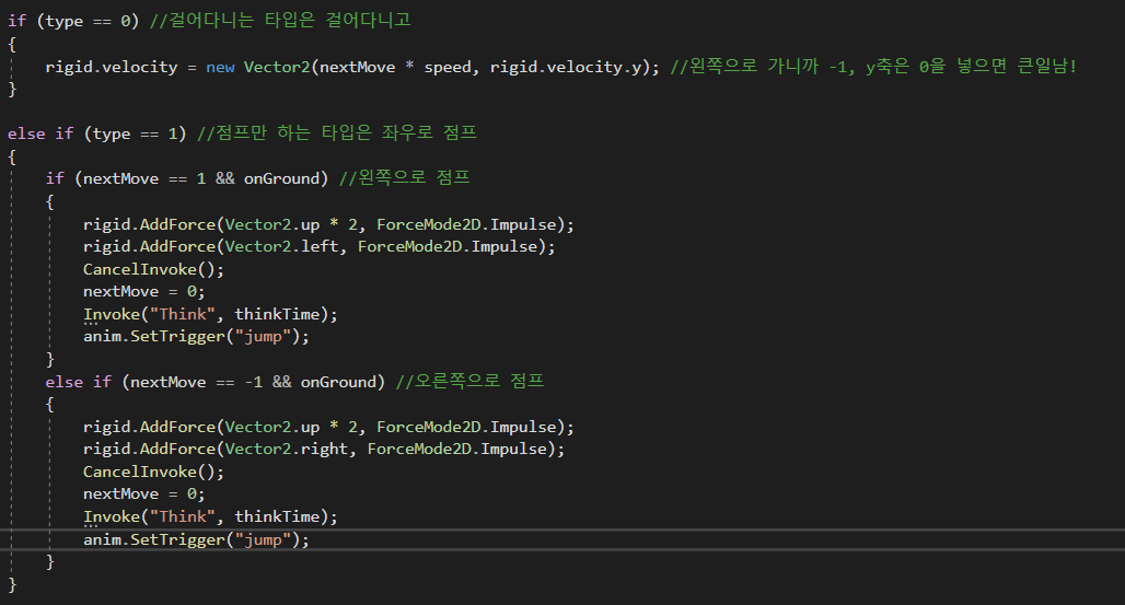 이를 구별하기 위해 걸어다니는 애들은 type = 0, 뛰어다니는 애들은 type = 1로 설정해 스크립트를 추가로 수정해준다,