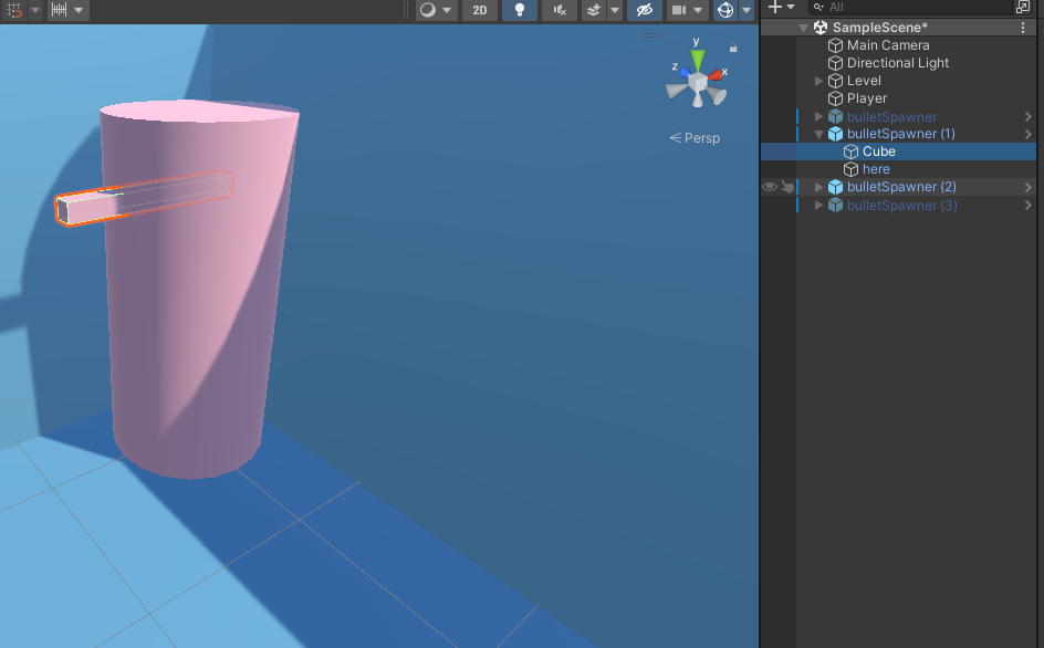 총구를 나타내기 위한 cube와 그 앞에 총알이 만들어질 포지션을 잡을 here empty object를 만들었다.