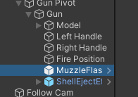 총을 쏠 때 떨어지는 탄피 particle과 총쏘는 빛 효과인 Muzzle particle을 Gun 위치에 추가해준다