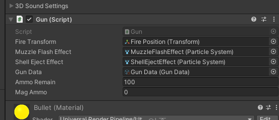 Scriptable Object를 받은 GunData에서 Asset Menu에서 이를 생성할 수 있게 만들어주었고, 총에 관련된 변수들을 선언해주었다