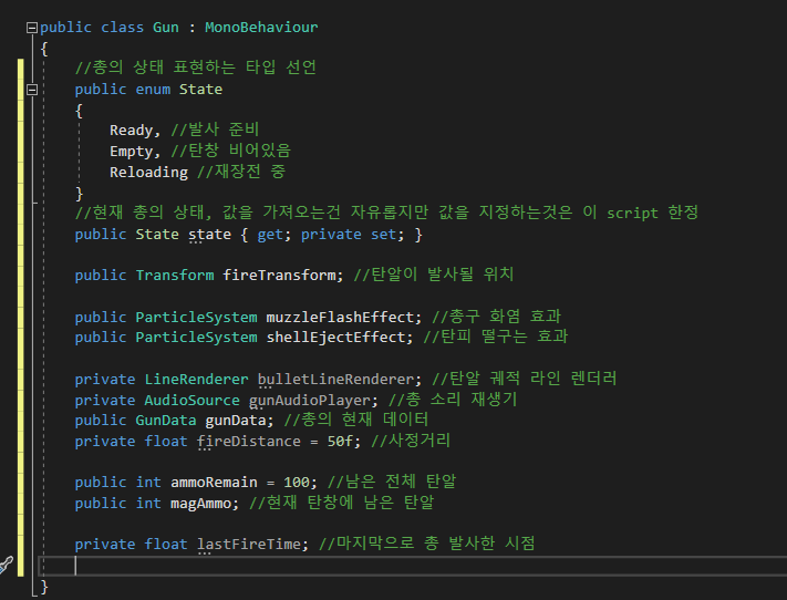 이를 이용해 마우스를 클릭할 시 발사 가능한 상태인지 체크하는 Fire() 메소드와 실제로 총을 발사하는 메소드를 만들어보자