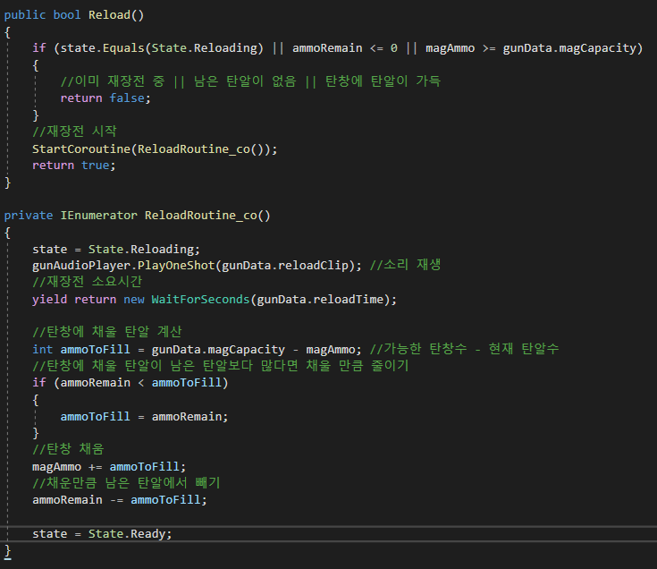 재장전이 가능한지 확인하는 Reload()와 재장전 하는 코루틴 함수로 나뉜다
