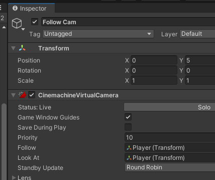 create empty > Follow cam으로 이름을 만들고 Cinemachine Virtual Camera component를 넣어준다
