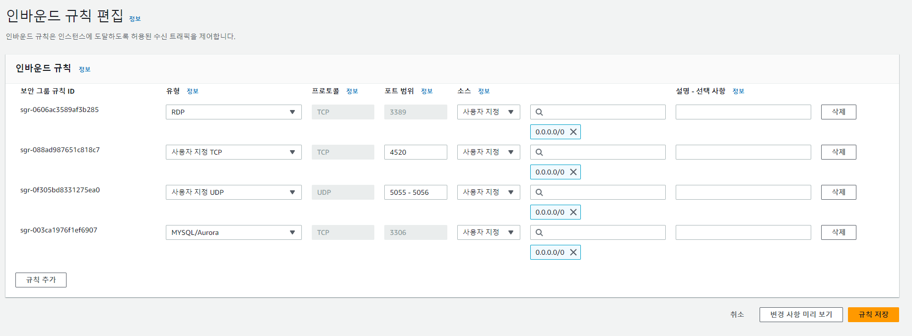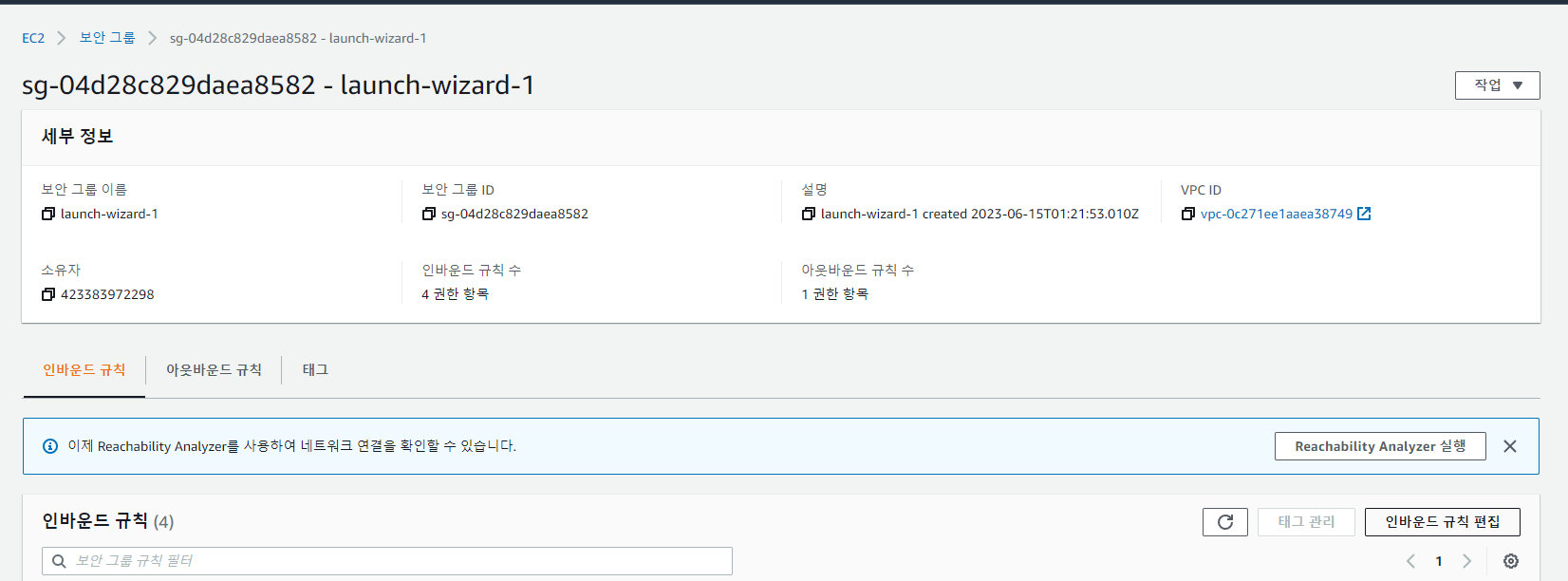 나는 미리 설정해놨지만 인바운드 규칙이 아마 하나만 있을텐데 이를 설정해주기 위해 인바운드 규칙 편집을 눌러주자