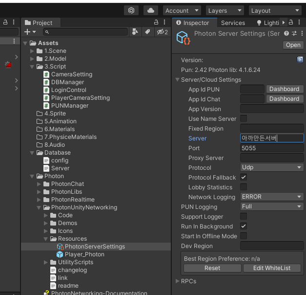 그리고 하이어라키 창에서 Photon Server Settings를 찾아서 아까 만든 public ipv4 서버 주소를 저기에 써주고 Port에 5055, Use Name Server를 꺼줍시다