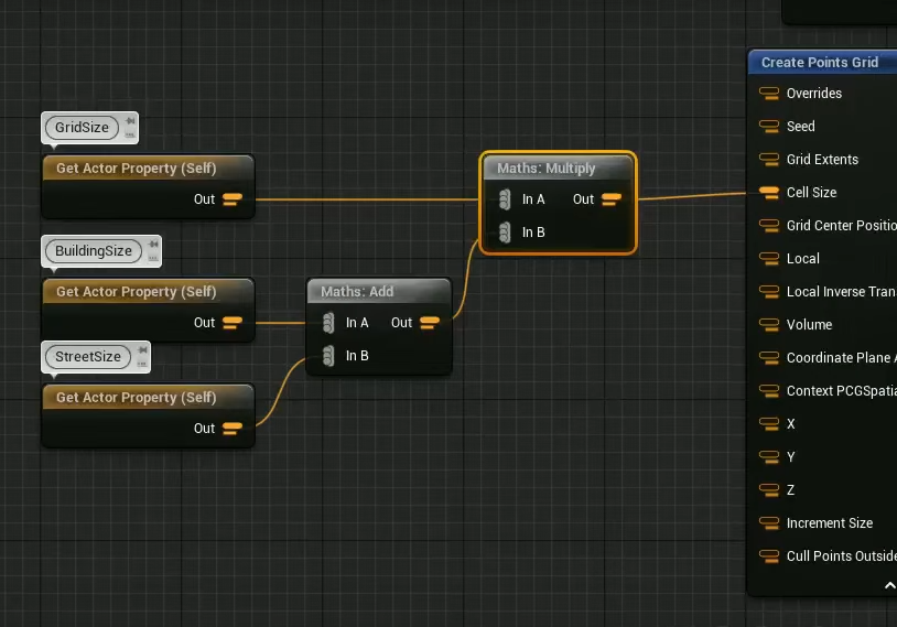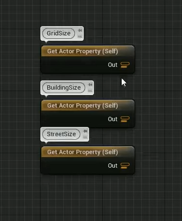 우리가 기존에 지정한 Grid의 Cellsize를 (BuildingSize + StreetSize) * GridSize의 값으로 설정할 것이고 이를 노드의 흐름으로 연결하면 3번째 그림과 같다.
