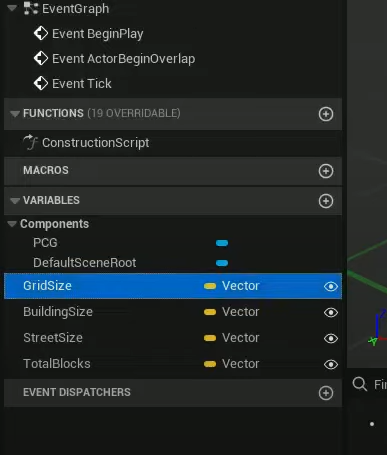 PCG_Buildings 블루프린트에 들어와 왼쪽 아래같이 변수들을 만들어 눈표시를 켜준다. (에디터 창에서 볼 수 있게끔)