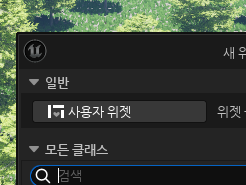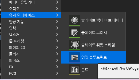 유저 인터페이스 > 위젯 블루프린트 > 사용자 위젯으로 만들어 이름은 원하는대로 설정해주자.